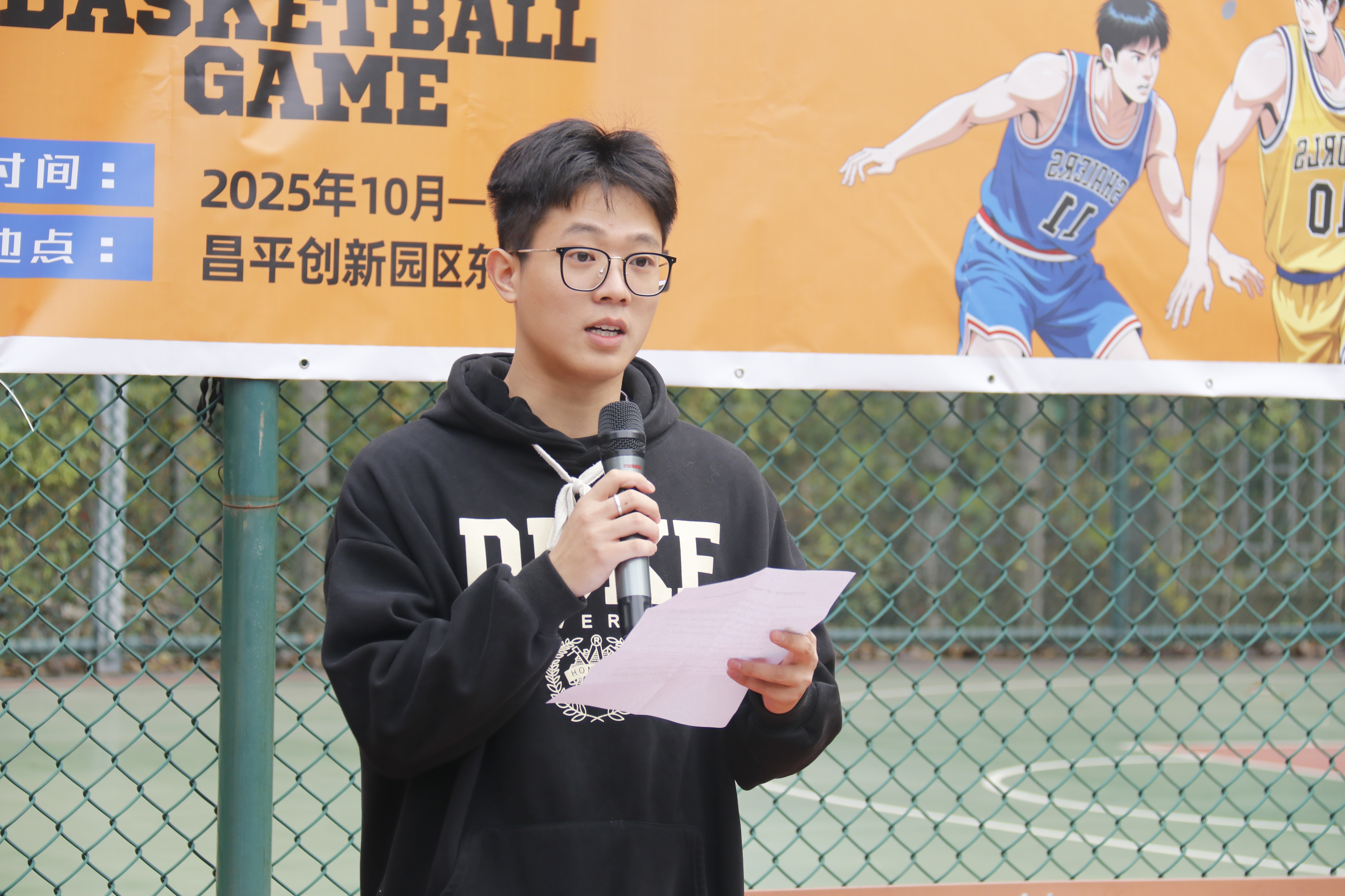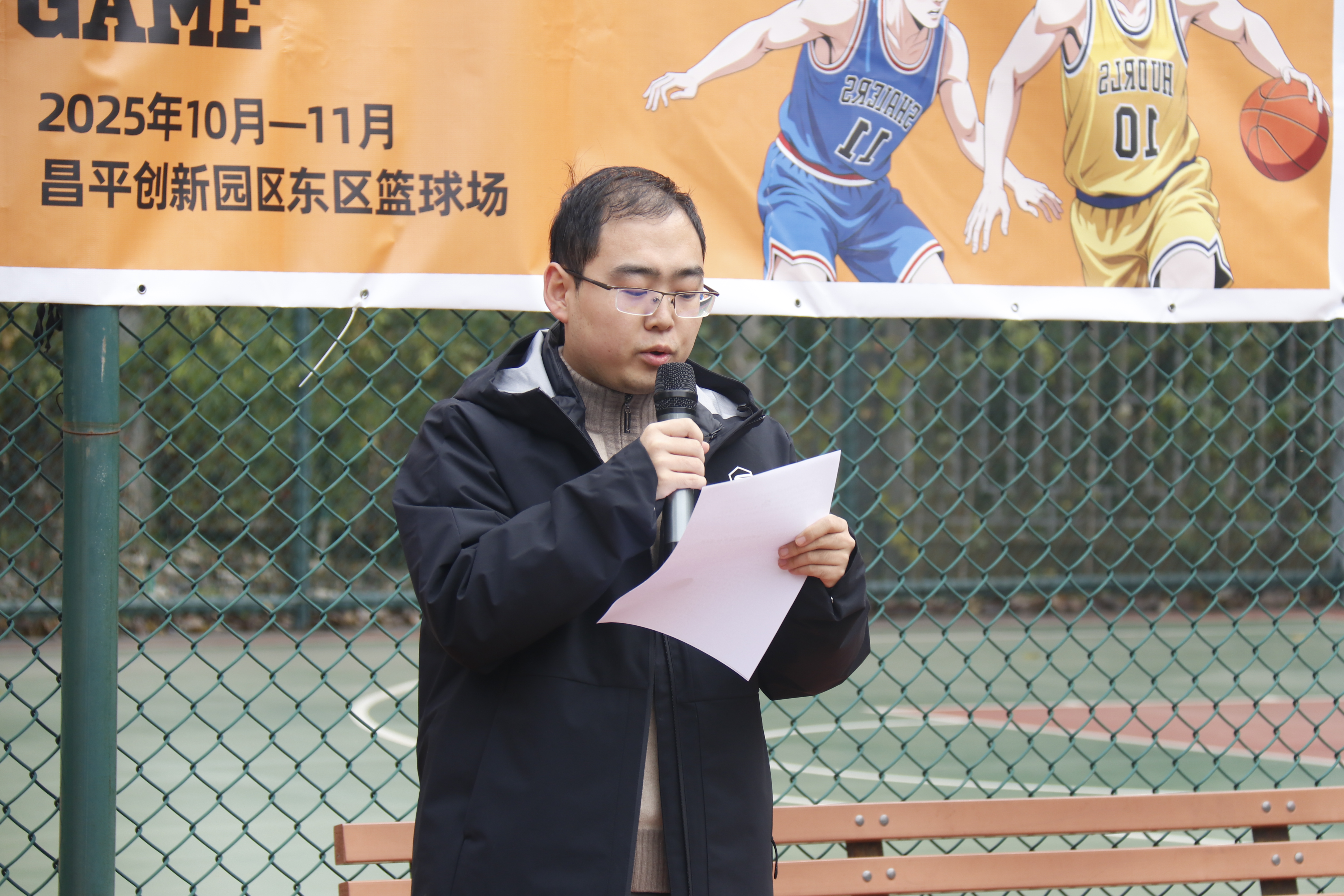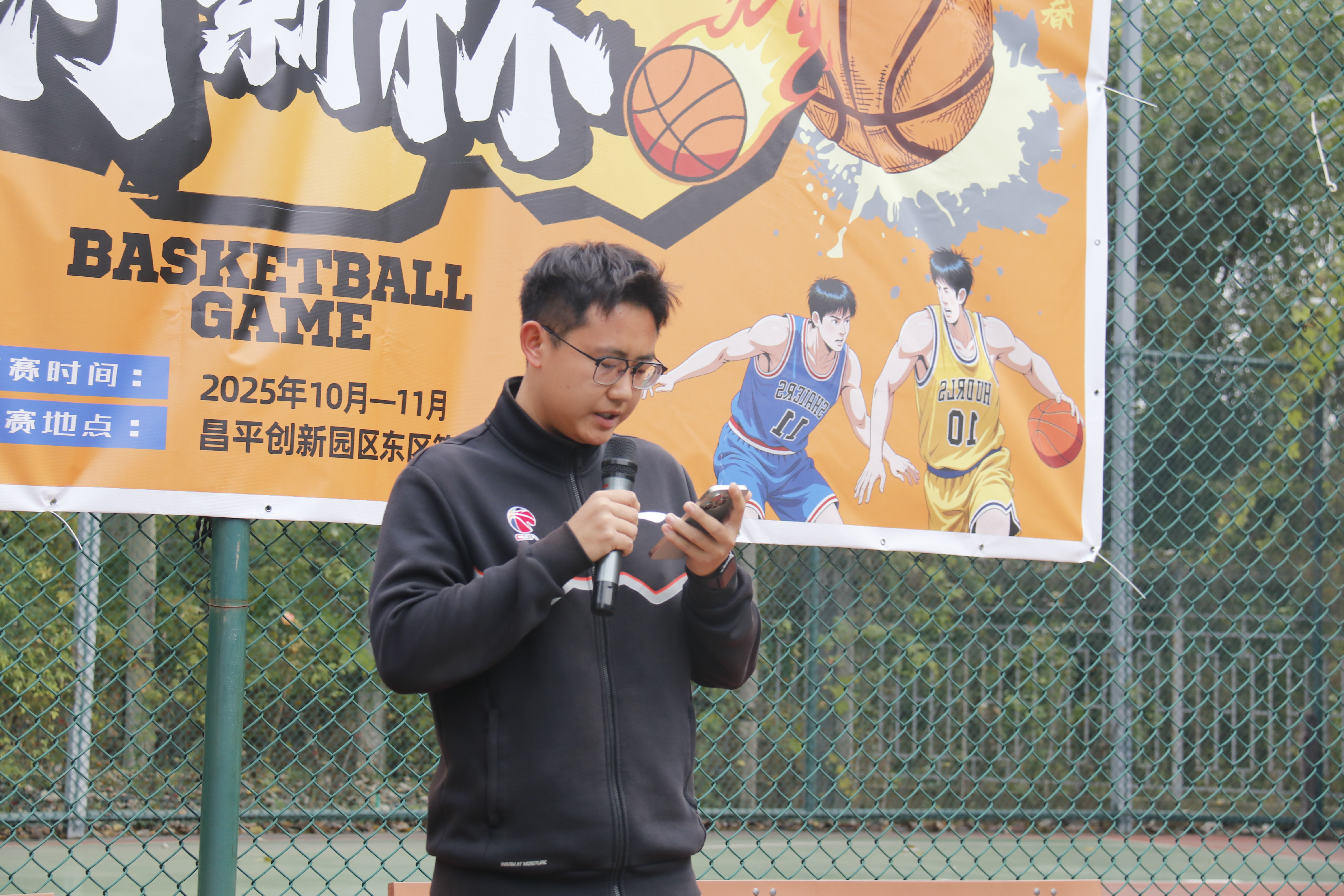 园区辅导员刘昊宣读本届篮球赛的赛制与赛程。本次篮球赛共有来自12家培养单位组建的8支参赛队伍,通过队伍间的多轮角逐,选出园区四强选手。