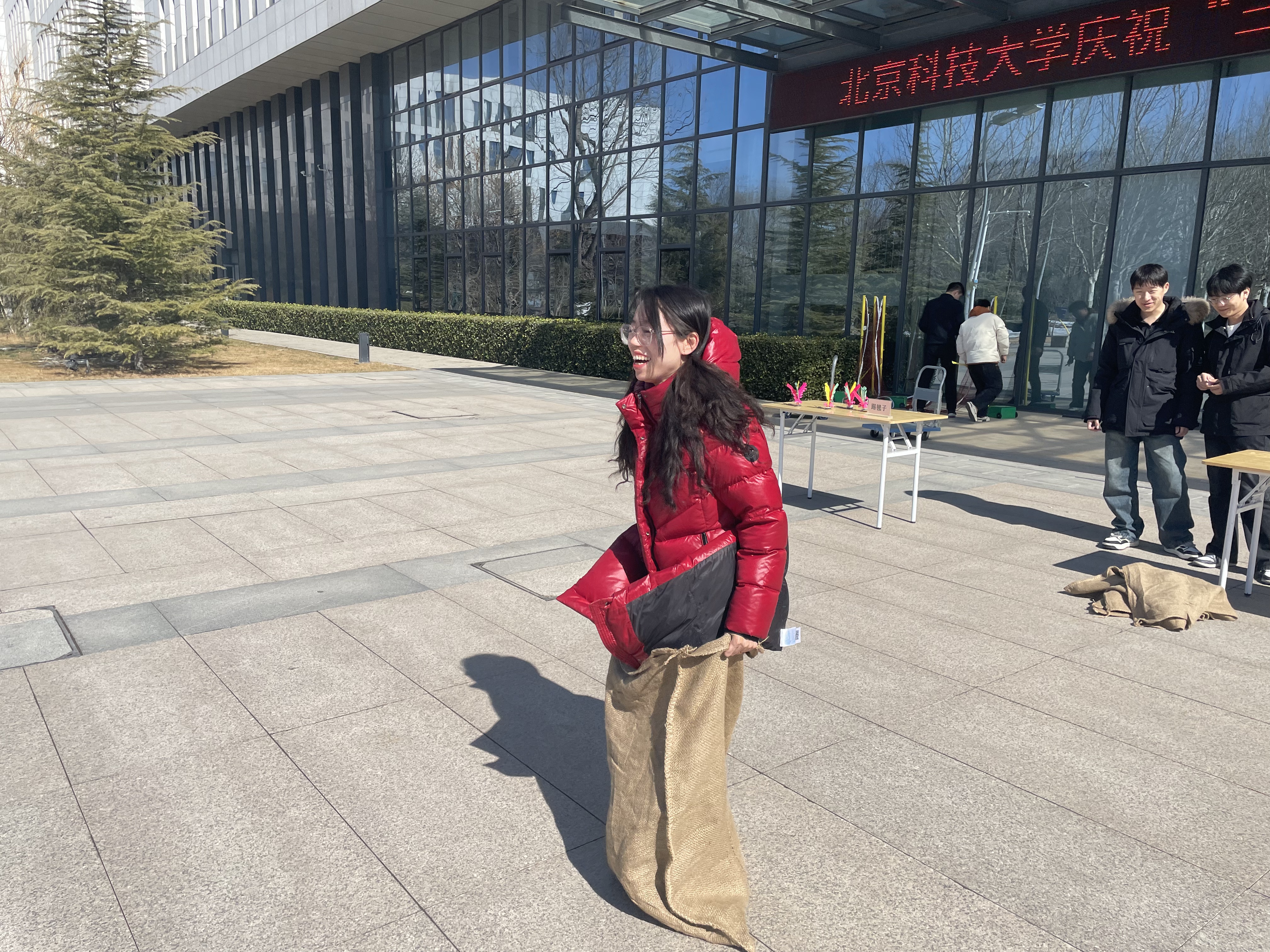 袋鼠跳赛场趣味拉满,老师们钻进麻袋,双手紧抓袋口,化身灵动 “袋鼠” 奋力向前跳跃,蹦跳间的可爱模样引得赛场边笑声、掌声不断。