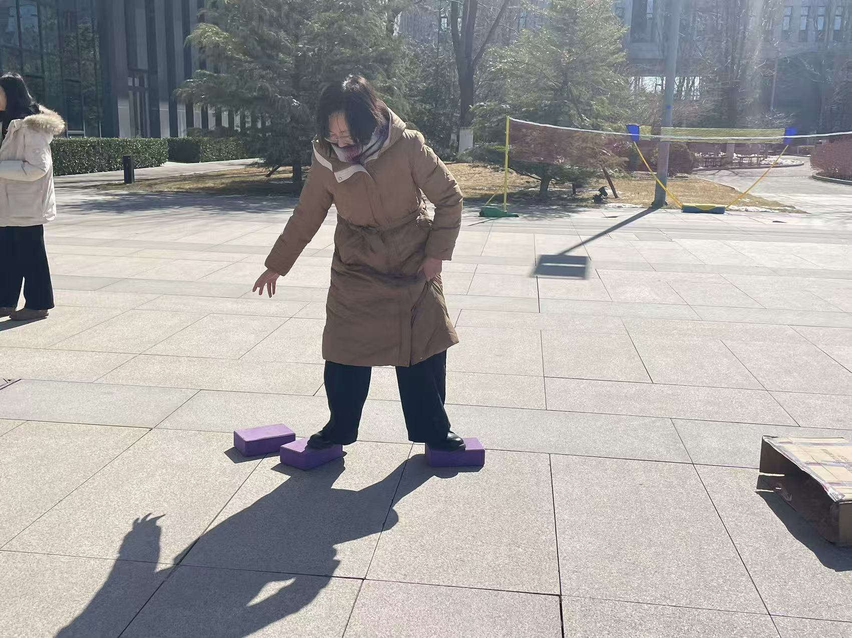 摸石头过河项目考验着大家的手眼协调与身体平衡,每人手持三块瑜伽砖,踩着砖交替向前挪动,老师们凝神专注,在方寸之间展现着别样的竞技智慧,现场助威声、喝彩声此起彼伏。