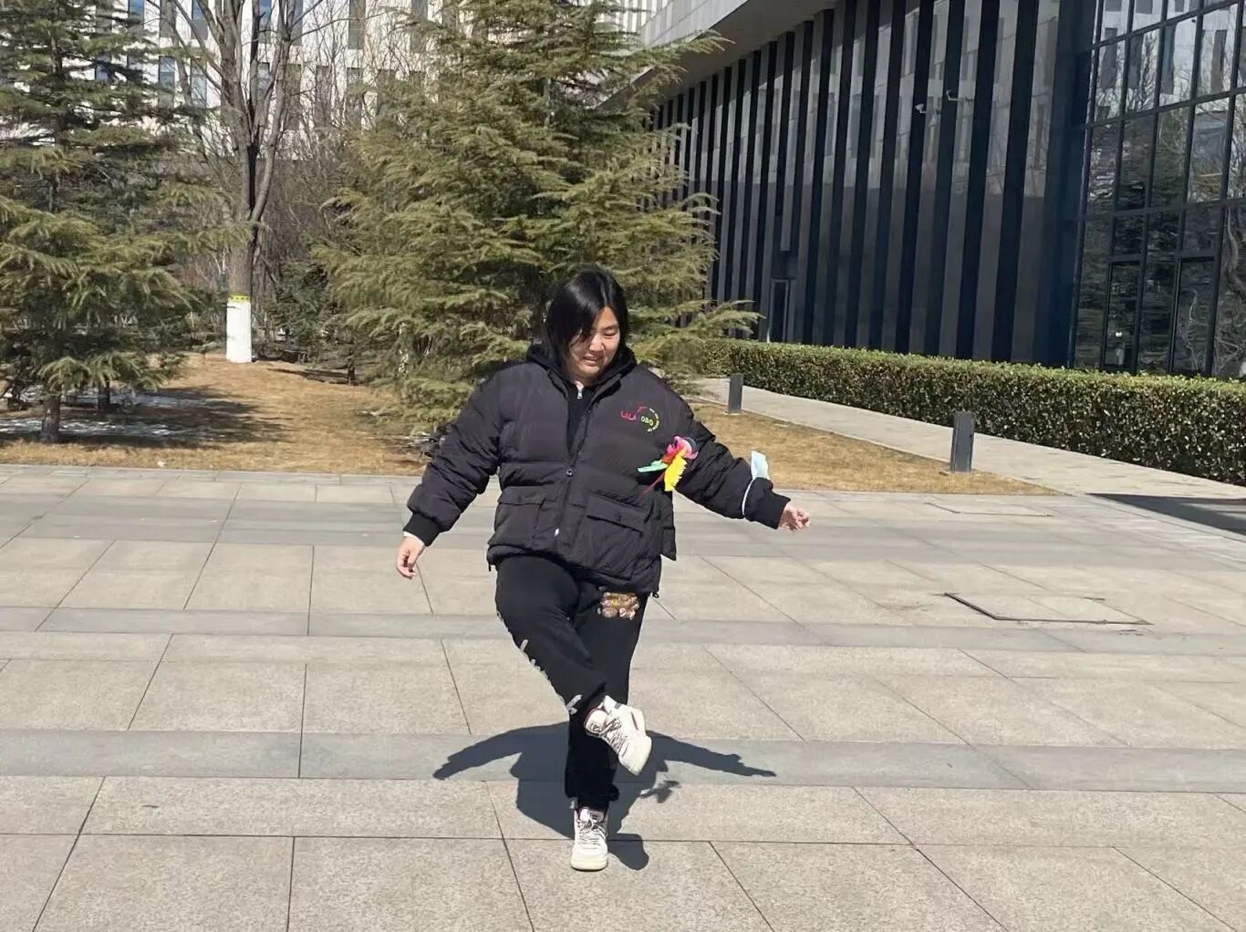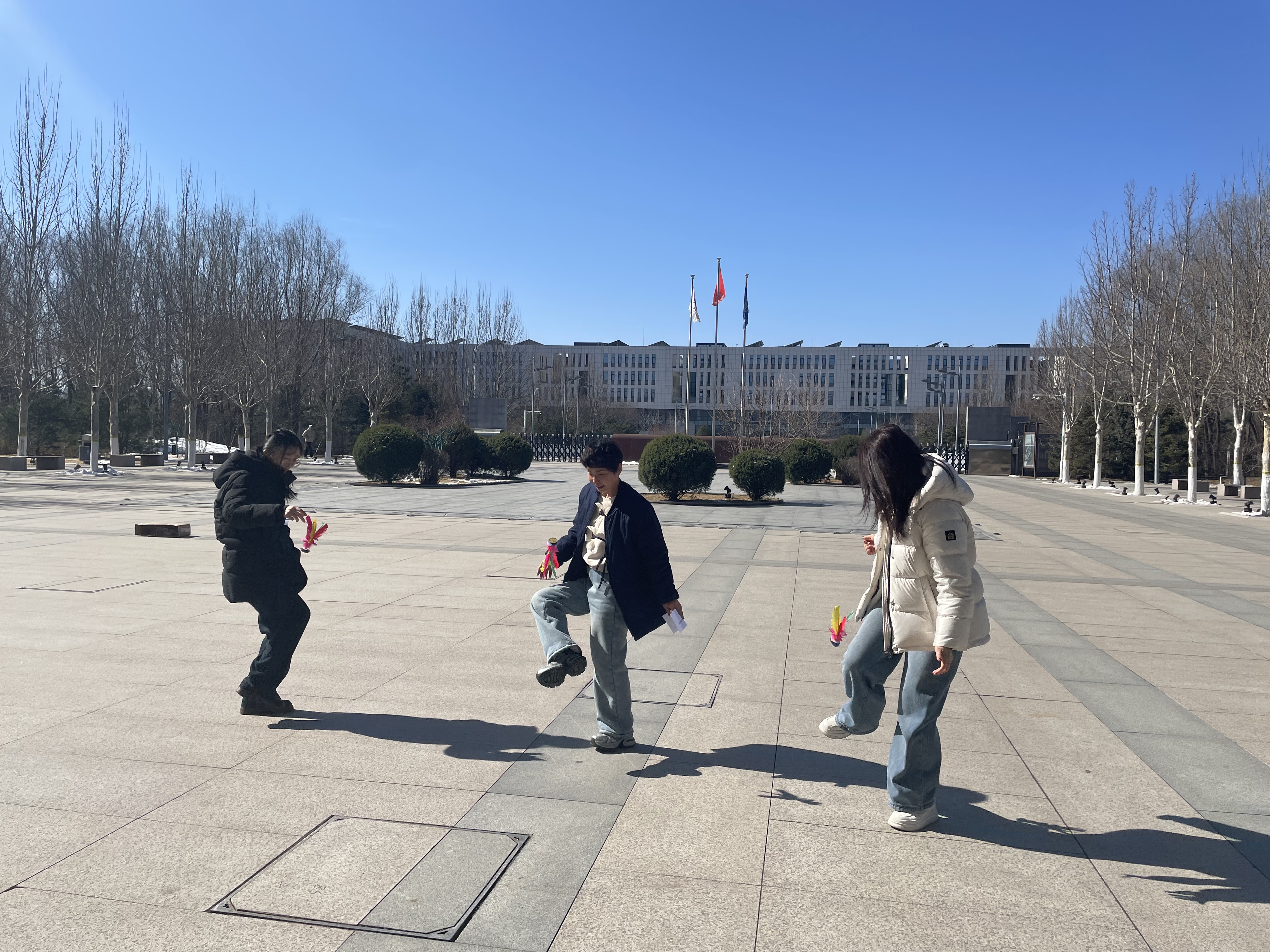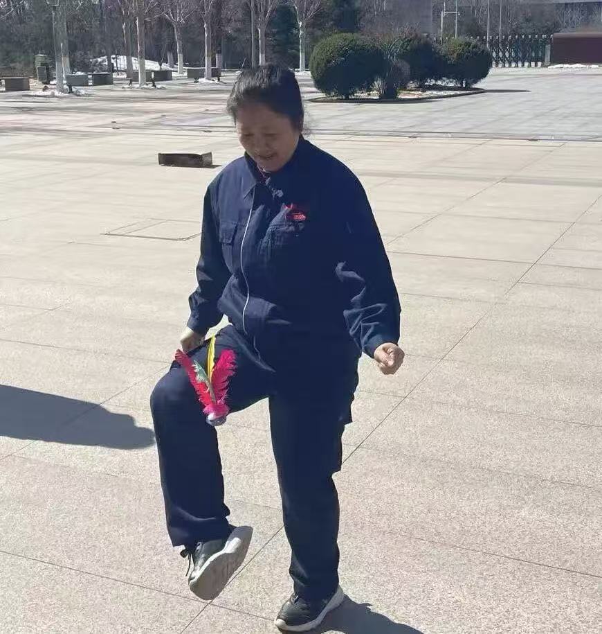 脚尖轻踮,彩毽翻飞,老师们身姿灵巧,腾转挪移间,毽子起落有序。