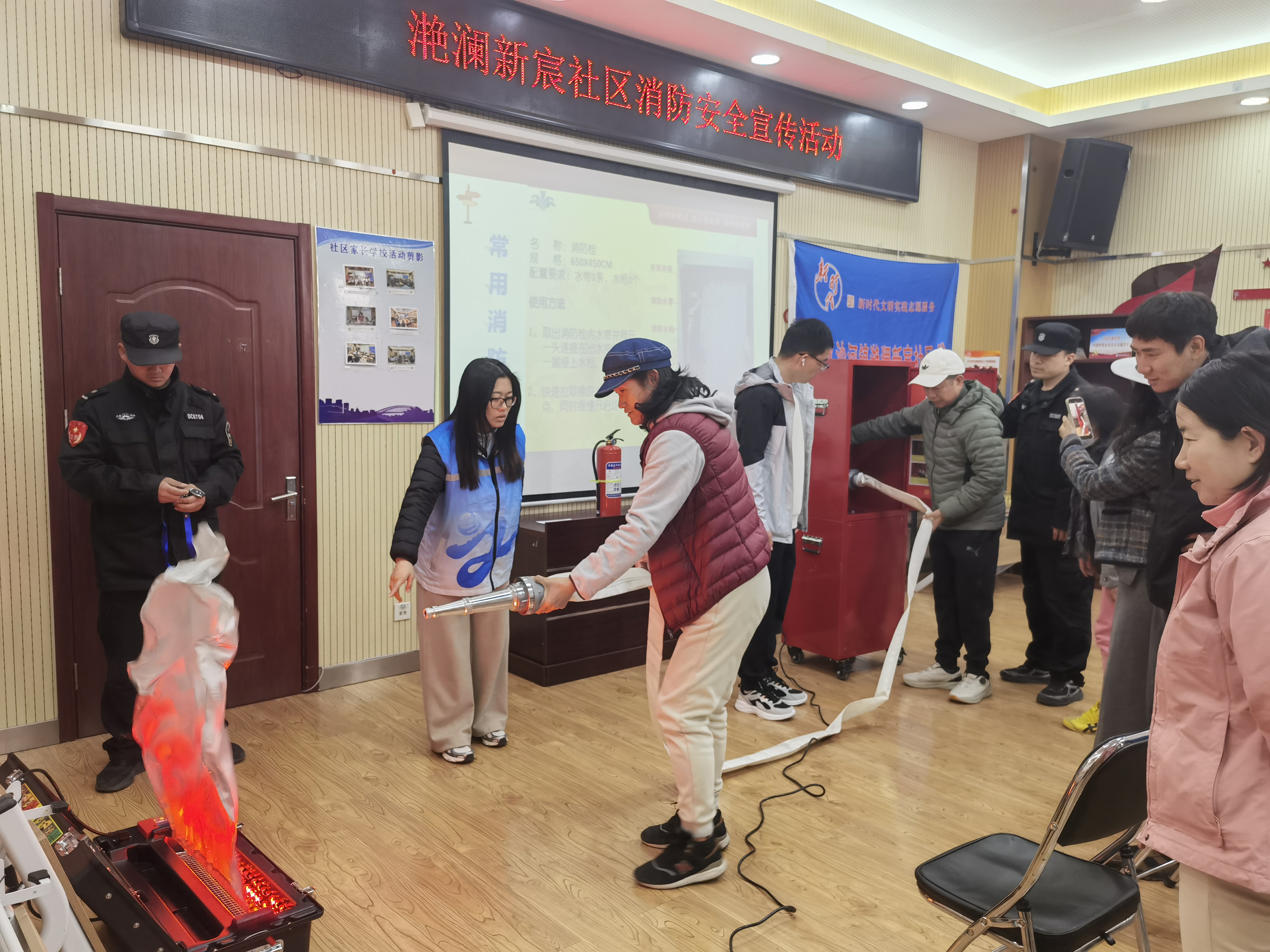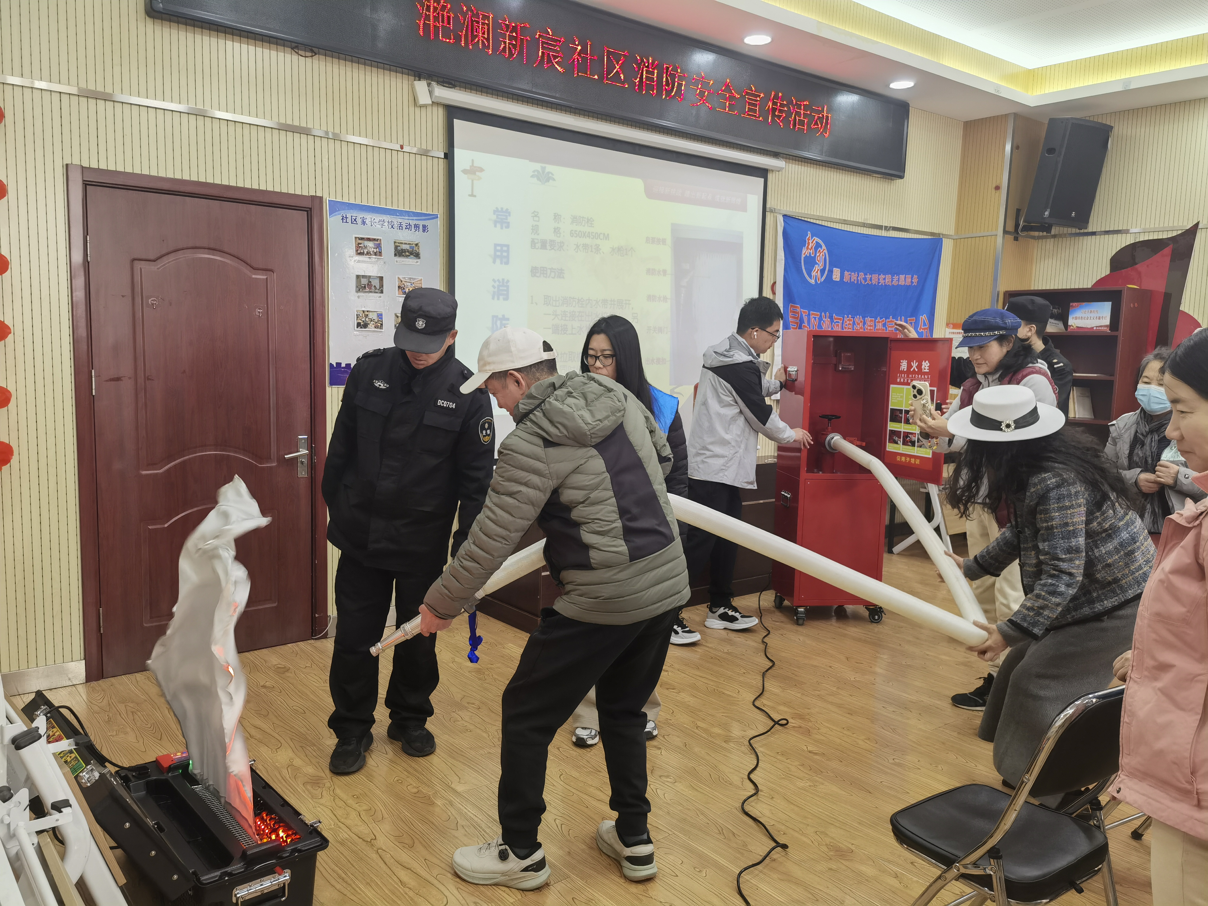 “提、拔、握、压!”园区安保工作人员与学生志愿者手把手指导居民操作灭火器,亲身示范如何对准火源根部喷射。在消火栓实操环节,大家合力展开水带、连接接口,模拟出水灭火流程,不少居民第一次亲手操作,切实掌握了 “救命技能”。