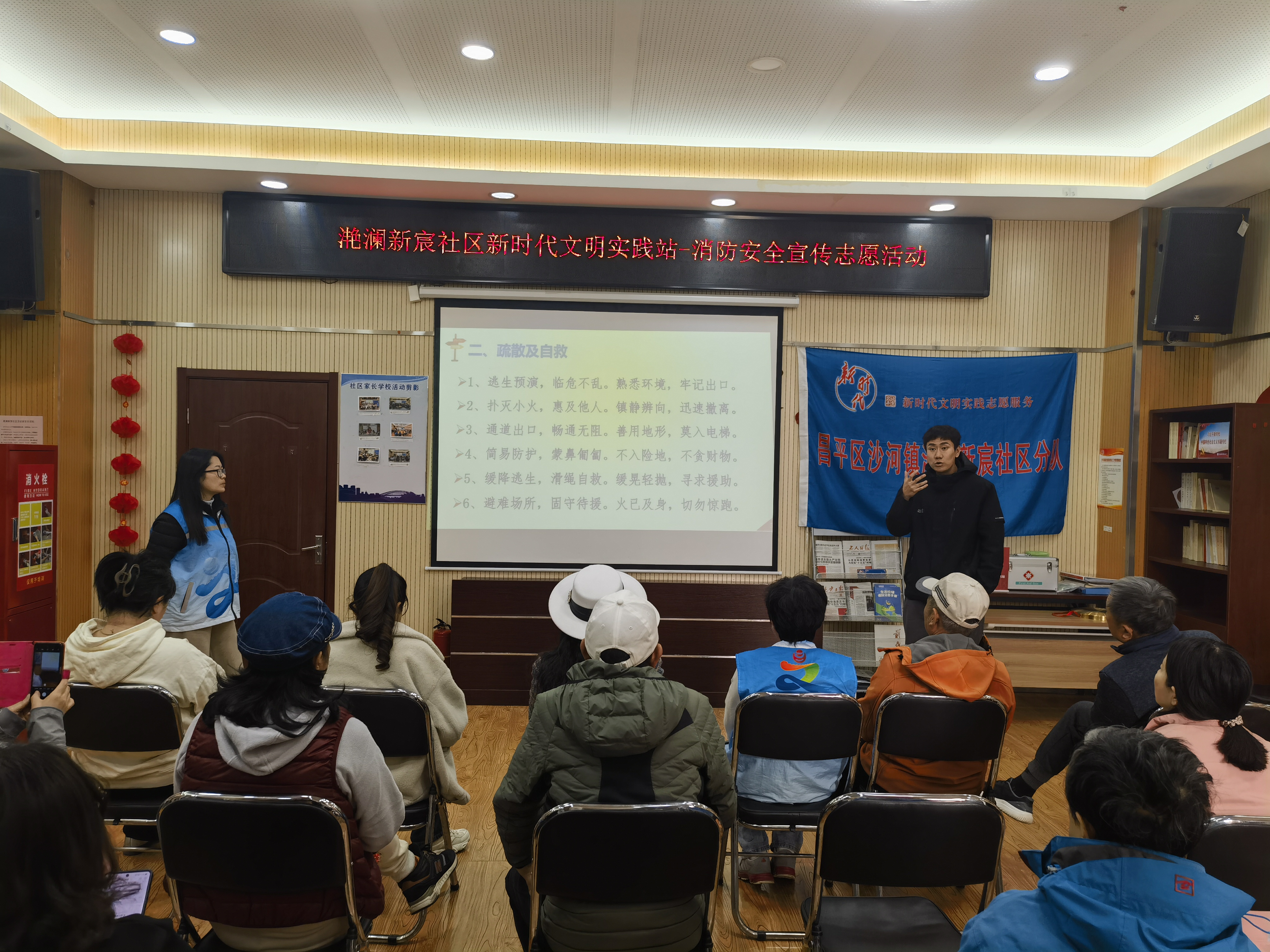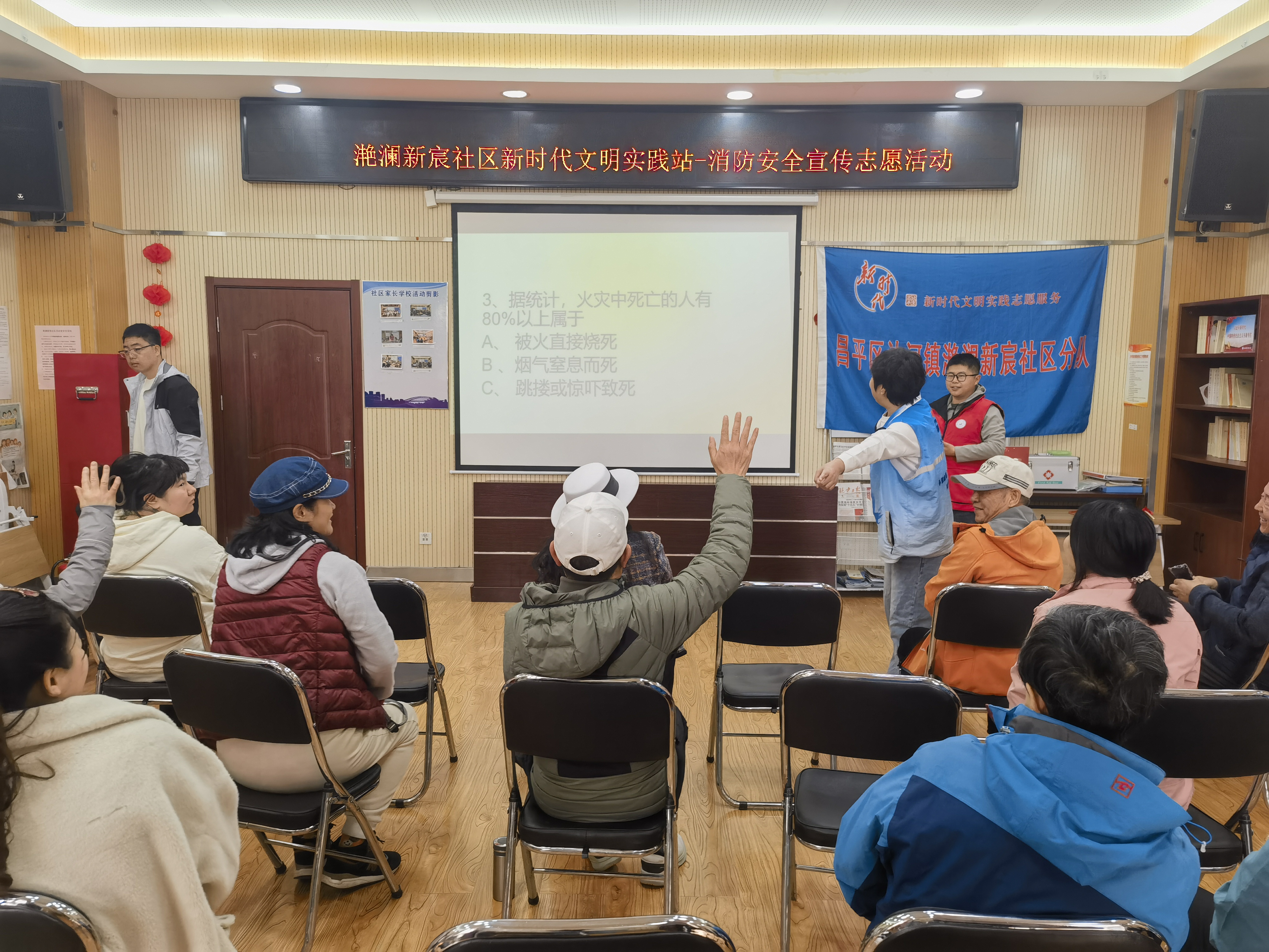 随后,园区学工组各位老师带领大家开展趣味消防知识问答。“火灾初起阶段是扑救火灾的什么阶段?”“电动车为什么不能进楼充电?” 等问题接连抛出,居民们踊跃举手抢答,在轻松互动中巩固了消防知识。