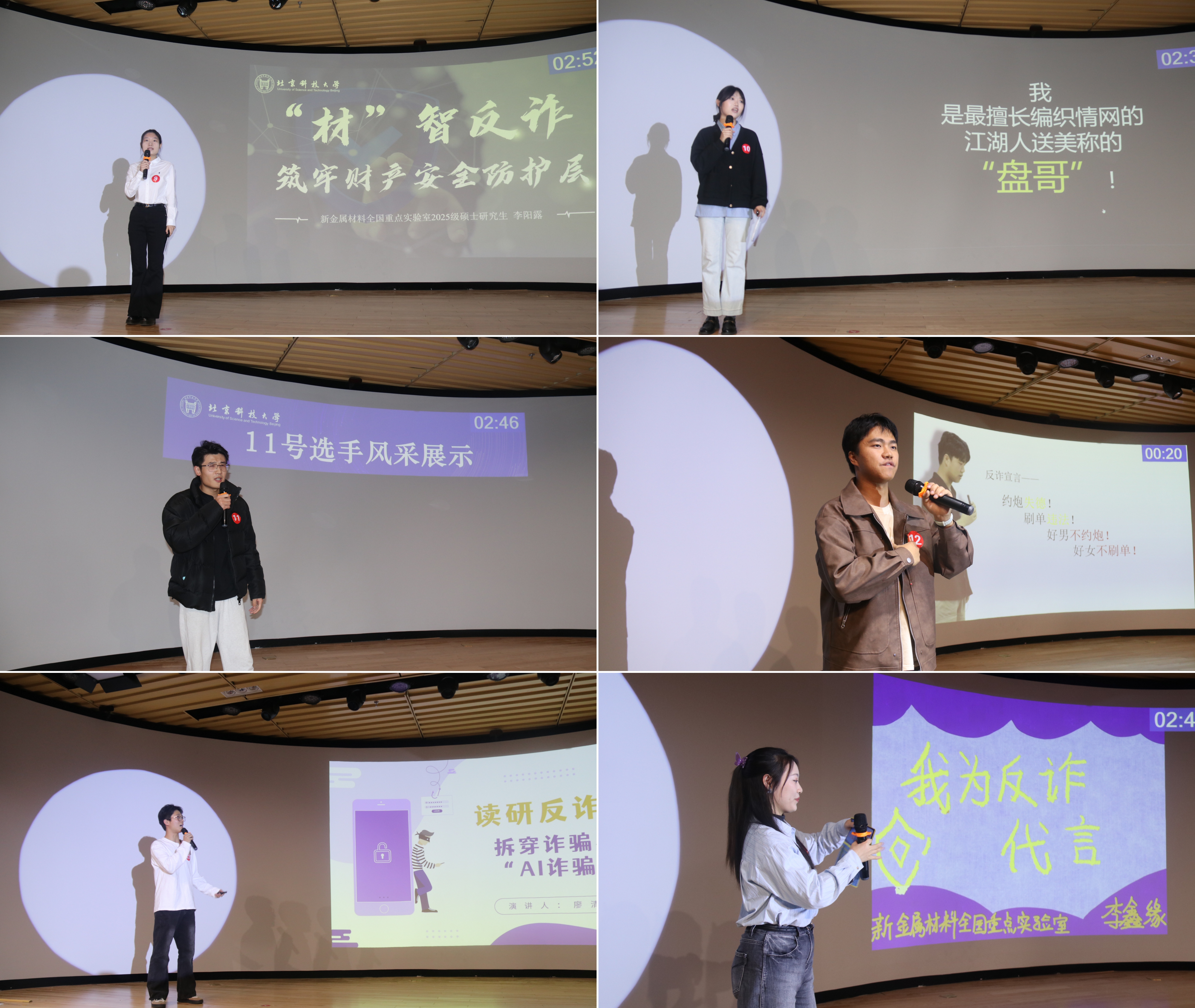主持人宣布活动开始,15名选手围绕“反诈代言”主题,结合自身经历与创意表达,展开精彩演讲。终评展示环节情景剧、脱口秀等展示形式不一,选手表现精彩,现场氛围浓烈!