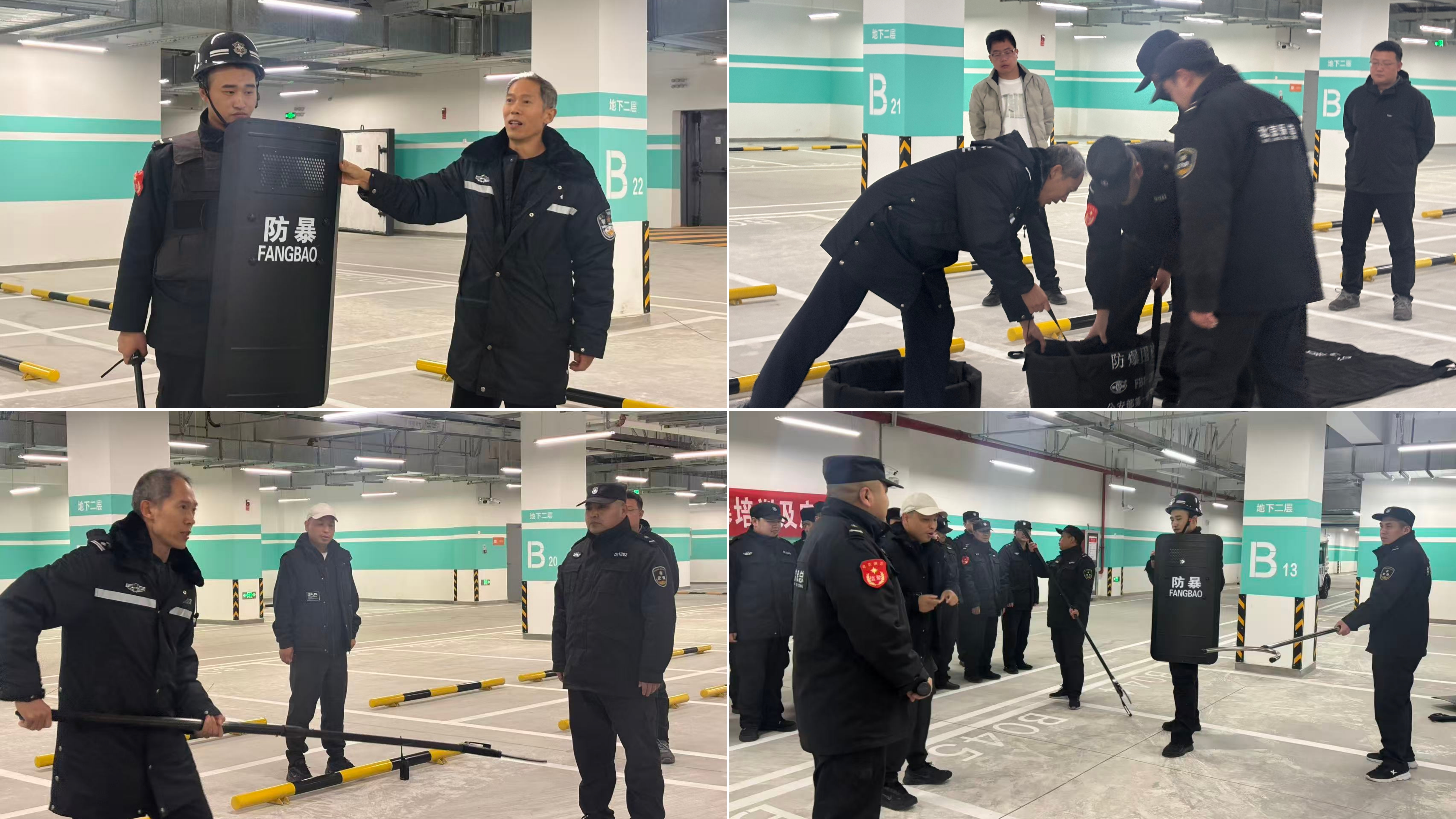 在随后进行的装备使用培训环节,校警李福旺与园区保卫部门王二永进行了现场讲解与实操演示。他们逐一介绍并演示了防暴盾、防暴棍、脚叉、腰叉及防爆桶等专用器械的功能特点、使用场景和操作要领,通过手把手教学,确保每位安保人员都能准确掌握器械的使用技巧和协同配合要点。