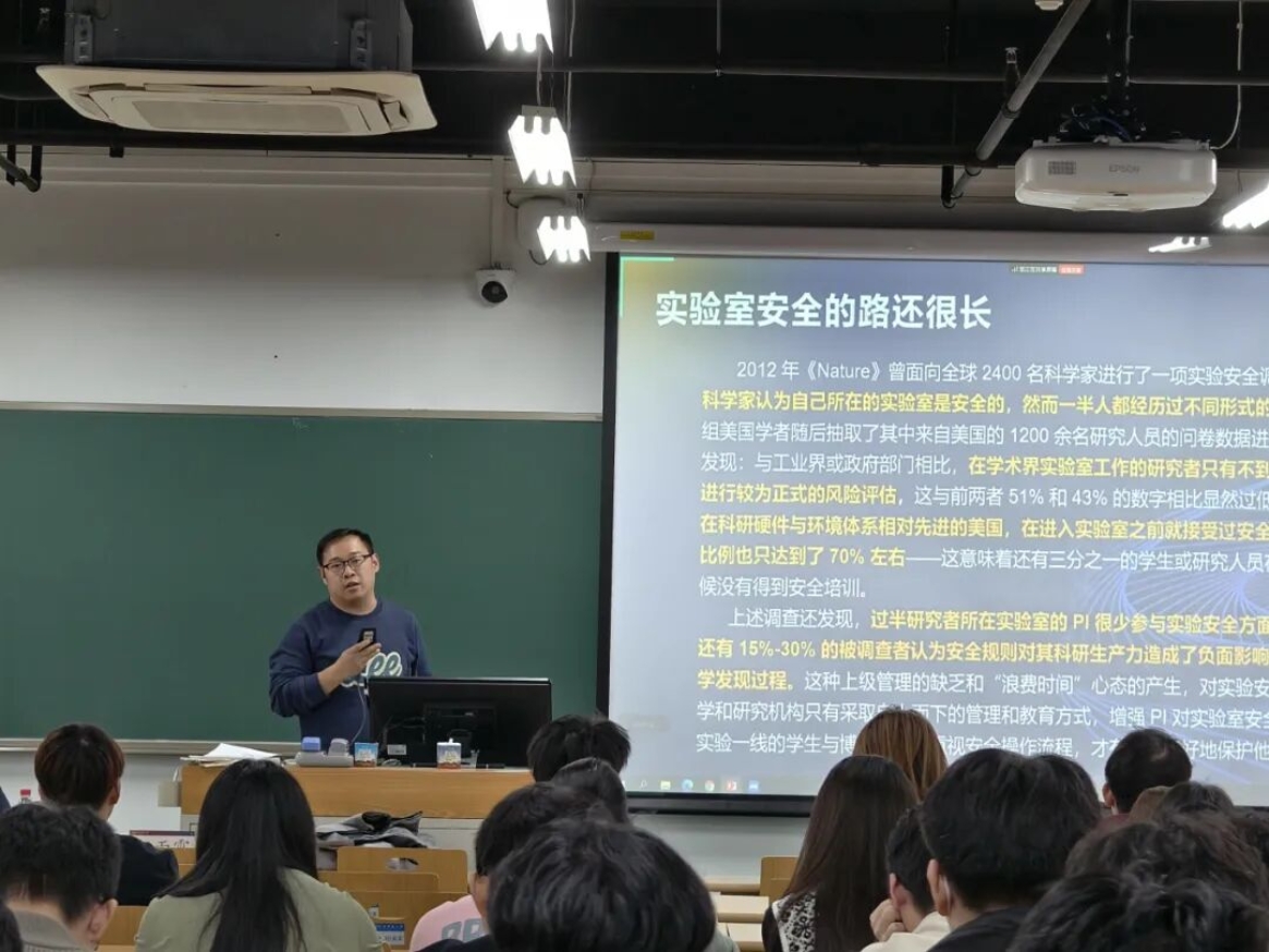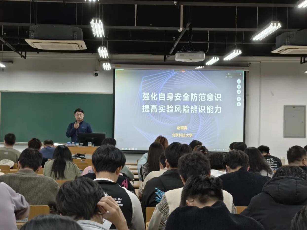 随后,赵雨霄从典型事故案例切入,深入剖析实验室常见风险点,明确实验人员的安全职责与行为规范,强调“防范在先、管控在前”的安全理念,助力同学们在科研道路上行稳致远。